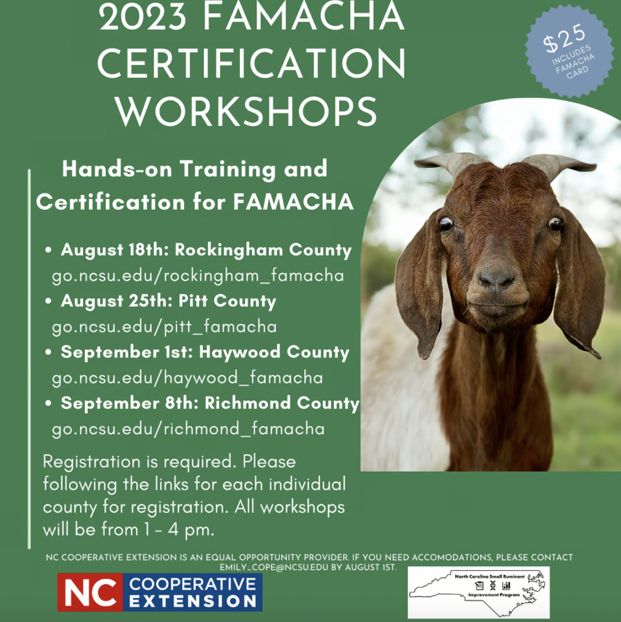 Small Ruminant Producers! Here is your chance to attend a local, hands-on, certification training for FAMACHA. This workshop will provide education on parasite control in small ruminants, as well as certify producers in FAMACHA. There is a $25 fee to cover supplies, the certification, and your FAMACHA card.