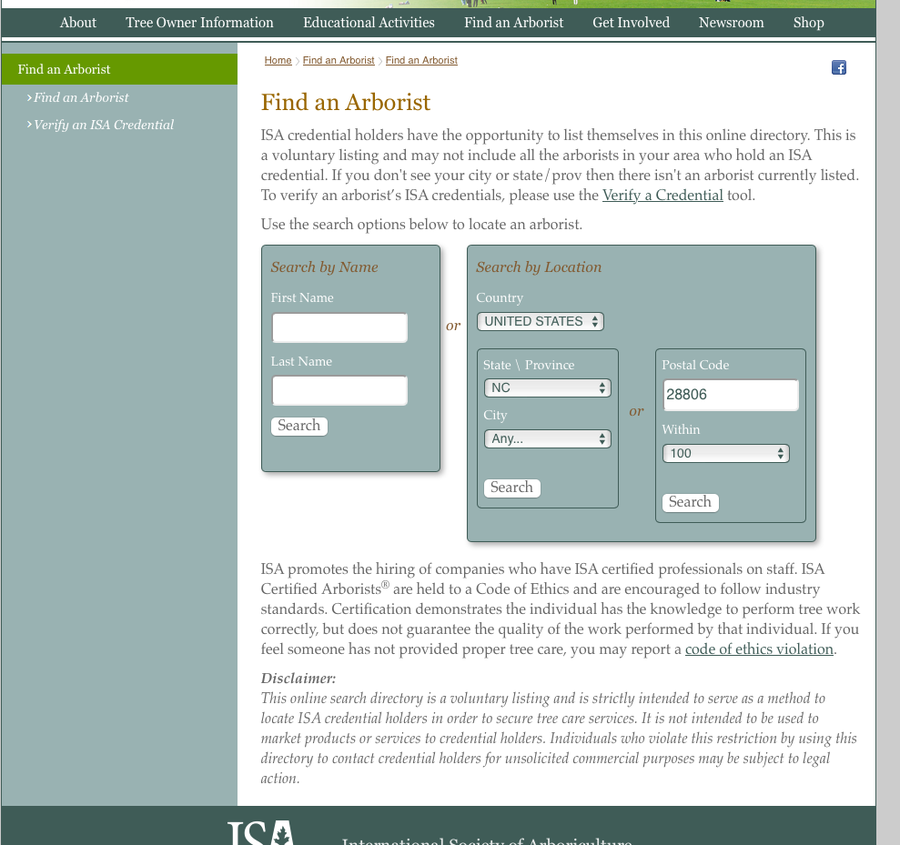 Visit treesaregood.org and select the Find an Arborist tool to see accredited arborists with ISA certifications near you! All you have to do is select the United States from the country drop-down list and enter your zip code. You will then see a list of arborists in your area that are certified and insured. See the photos below that will help guide you through this simple process: