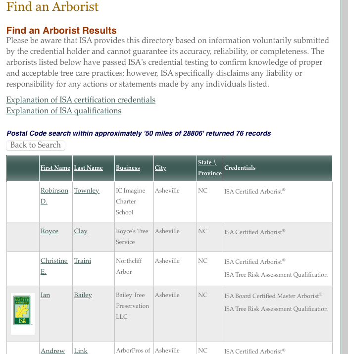 4. You will now see a complete table listed with ISA certified arborists in your region. Note that beside each arborist it will list specific accreditation categories that include tree risk assessment as well as others (see Credentials column below). Note that the company name is also given, as well as the first and last name of the specific arborist. To find contact information for the company, simply click on the arborist's name and their contact information will be pulled up.