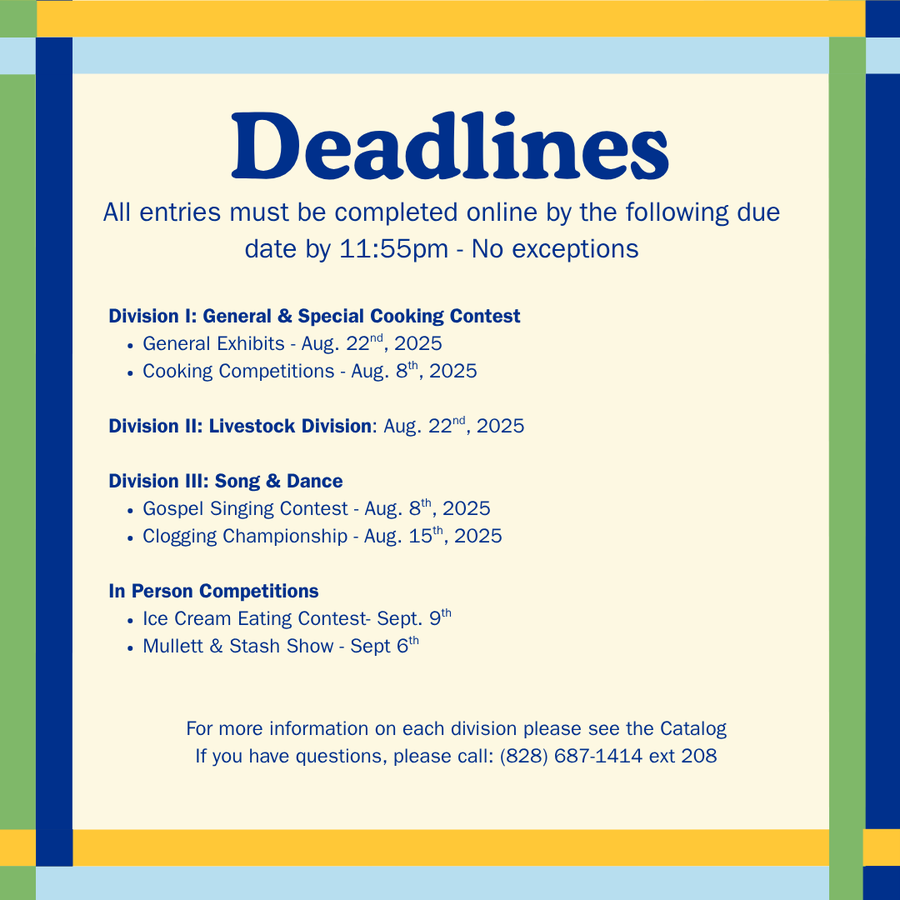 All entries must be completed online by the following due date by 11:55 PM – No exceptionsDivision I: General & Special Cooking Contest